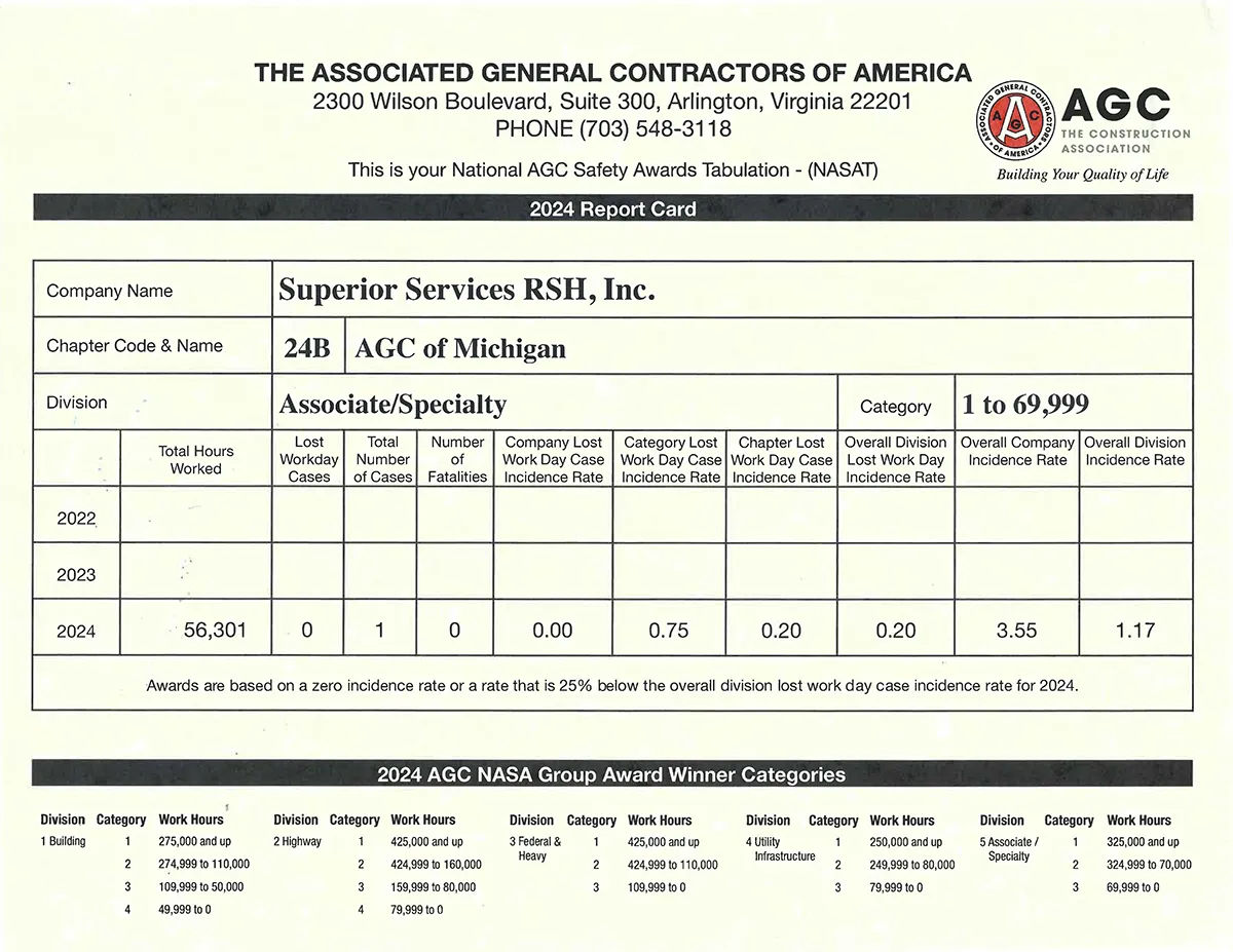 At Superior Services RSH, safety isn’t just a box to check—it’s how we protect people, projects, and reputations. We’re proud to share that our team has earned the 2024 National AGC Safety Award (NASA) through AGC of Michigan, recognizing our ongoing commitment to an excellent safety record and culture.