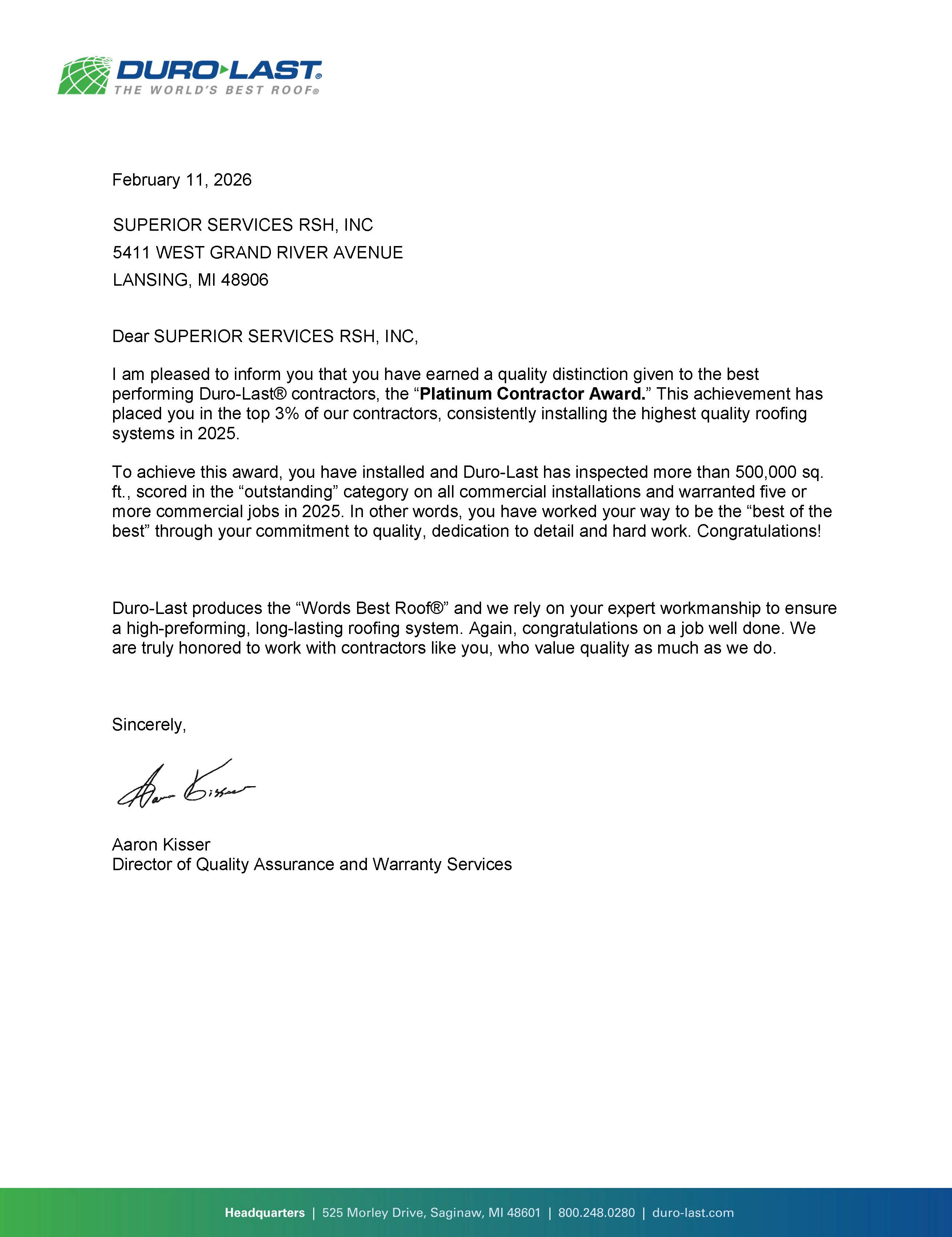 According to Aaron Kisser, Director of Quality Assurance at Duro-Last, this achievement places Superior Services RSH in the top 3% of contractors. This award reflects our "commitment to quality, dedication to detail and hard work".
